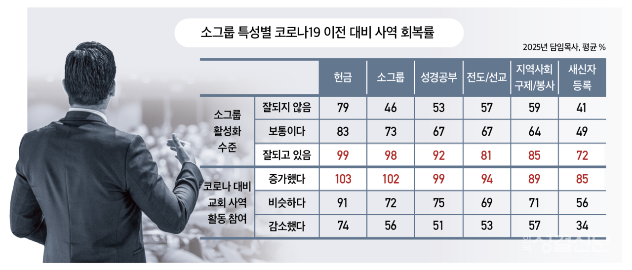 이에 대해 연구소 측은 “코로나19 이전 대비 주요 사역 평균 회복률을 살펴보면 소그룹 활성화에 따라 최대 2배 이상 차이를 보인 곳도 있다”며 “결국 교인들의 다양한 활동과 참여가 사역의 역동성을 가져오고 성장에도 영향을 미친다는 것을 알 수 있다”고 설명했다.