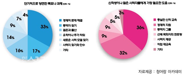 이 밖에도 ‘동역자 그룹’(9%)과 ‘선배 목회자들의 멘토링(9%)’이 필요하다는 응답도 많았으며, 새로운 직업을 받을 수 있도록 ‘직업 재교육’(5%)이 필요하다는 응답도 소수이지만 나와서 눈길을 끌었다.
