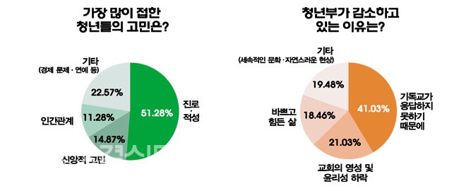 청년 사역자들은 ‘지난 1년 간 가장 많이 접한 청년들의 고민’으로 진로·적성(51.28%) 문제를 꼽았다. 신앙적 고민(14.87%), 인간관계(11.28%), 경제적 문제(8.72%) 등이 그 뒤를 이었다.