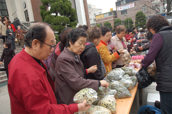 봄기운이 완연한 지난 3월 18일 오전 11시 신촌교회(이정익 목사)의 앞마당에 농산물 직거래 장터가 열렸다. 충주 야촌교회(박훈서 목사)와 전원교회(한석봉 목사)의 성도들이 재배한 친환경 농산물을 도시 성도들에게 판매하기 위한 직거래 장터가 열린 것. 벌써 4년째 열리고 있는 수요장터에는 교인뿐만 아니라 지역주민들도 찾아와서 그야말로 시골 장터처럼 발 디딜 틈도 없다.
