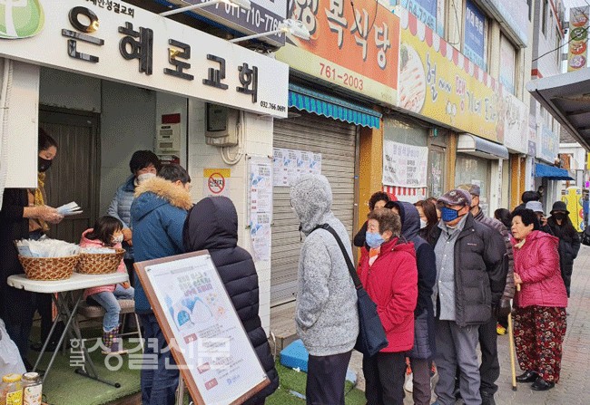 은혜로교회는 지난 3월 13일 교회 입구에서 어른용 KF94 마스크와 손 소독제, 어린이용 면 마스크와 손 소독제를 담은 위생용품 150개를 지역주민에 나눴다. 오후 5시부터 시작된 나눔에는 일찌감치 주민들이 줄을 서서 교회 측이 준비한 용품을 받아갔으며 거동이 불편한 어르신과 장애인에게는 직접 가정에 방문해 전달했다.
