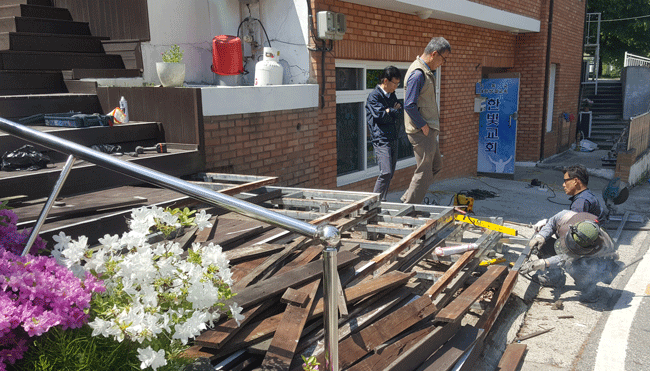 교회의 오랜 기도제목이었던 계단과 교육관을 보수하게 되는 은혜도 체험했다. 본당을 출입하는 계단이 외부에 노출되어 있다보니 비, 바람, 햇빛과 추위에 많이 상해서 수리를 해야 했는데 소망교회(김호성 목사) 지역사회봉사팀에서 계단수리를 섬겨준 것이다.