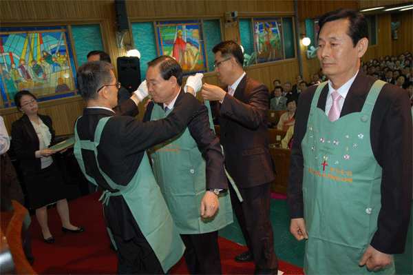 이날 앞치마를 입고 임직식을 집례 한 홍 목사는 “장로뿐만 아니라 모든 임직자들이 앞치마를 입었다고 생각하고 섬김의 모범을 보여 줄 것”을 주문했다. 예식에서 앞서 서울남지방회장 신익수 목사도 “하나님 앞에서 겸손하며 돌보는 리더십을 발휘할 것”을 강조했으며, 전 총회장 이정익 목사와 이정운 목사(강변교회), 조영한 목사(흑석중앙교회) 등도 “앞치마를 벗지 말고 끝까지 헌신하고 봉사할 것”을 권면했다.