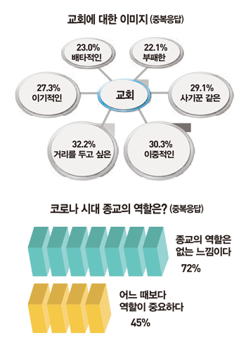 ‘요즘 우리 사회는 종교계의 역할이 그 어느 때보다 중요한 시점이다’라는 질문에는 응답자의 45%만 동의했다. 반면 ‘코로나 사태라는 중차대한 시국에 솔직히 종교가 한 역할이 없는 느낌이다’에는 72%가 동의했다. 향후 종교계의 전망을 묻는 질문에는 종교계의 위상이 낮아질 것으로 본 응답자가 57%였다. 코로나19를 계기로 종교계에 변화가 있을 것으로 본 응답은 55%, 사회적 거리두기를 경험으로 종교시설을 찾는 이가 줄어들 것으로 예상한 사람은 39%였다.