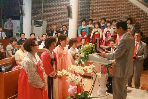 이어진 임직식에서는 김금자 박옥임 씨를 명예권사로 추대하고, 윤용애 이상희 김연이 씨 등 12명이 권사로 취임했다. 또 문일성 씨 등 4명이 집사로 안수를 받았다. 이날 새로 취임한 권사들에게는 사랑과 섬김에 앞장서라는 의미로 고무장갑과 행주치마를 선물해 참석자들의 눈길을 끌었다.