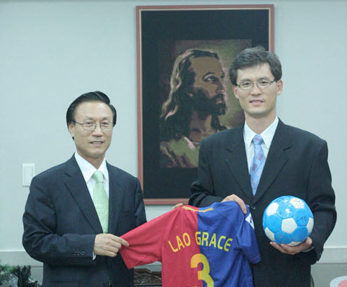 주남석 목사(세한교회)가 라오스에서 ‘라오그레이스FC’ 축구 클럽을 만들어 스포츠선교를 하는 이승엽 선교사에게 어린이 유니폼 25벌을 기증했다.