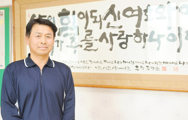 김광운 목사(동순천제일교회·사진)는 사람들과 어울리기를 좋아하고 테니스와 족구, 축구를 즐긴다. 매년 목회자테니스대회와 축구대회 등은 빠짐없이 참여하며 동네 조기축구회에도 나가 사람들과 어울린다. 그러나 김 목사의 특기요 자랑은 붓글씨다.