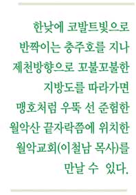 월악산 국립공원 내에 위치한 월악교회에는 인적이 드문 탓에 짙은 녹음과 계곡에서 흐르는 시원한 물소리 외에 다른 소리가 들리지 않는다. 그도 그럴 것이 달이 뜨면 산중에 걸린다는 ‘월악’이라는 이름에서 알 수 있듯이, 첩첩 산중 두메산골 교회이기 때문이다.