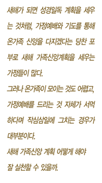 올 한해 가족들의 신앙이 더 발전하고 성장해 가길 원한다면 실현가능한 것부터 시작해 보자. 가족예배의 첫걸음은 즐거운 가족모임을 만드는 것. 식사자리에서 자녀를 혼내지 않는 습관을 키워 함께 모이는 식사시간을 즐겁게 만들고, 식탁교제로 이어가 식사모임 후 예배가 이어질 수 있도록 하는 단계별 노력이 필요하다. 가족들이 한자리에 모이는 것 자체가 즐거워질 수 있도록 하는 것은 부모들의 노력에 달려있다.